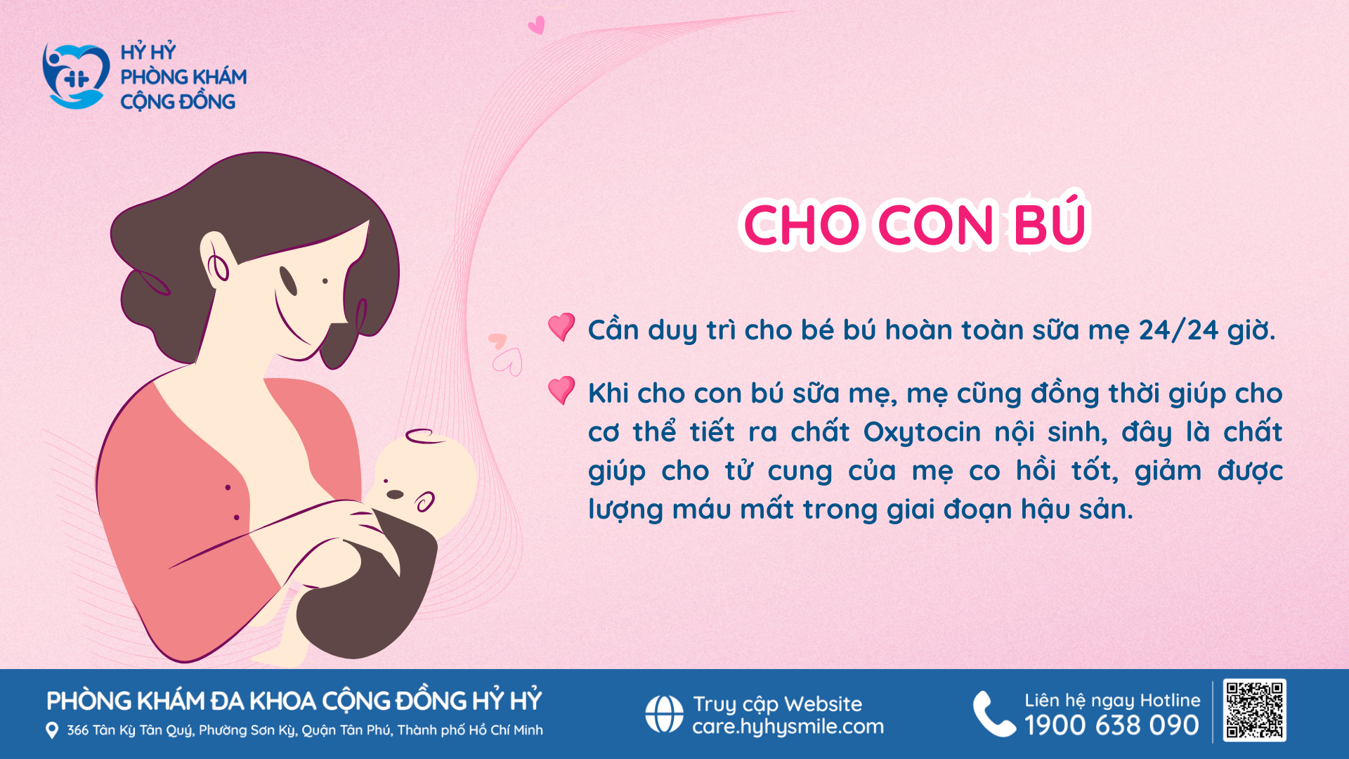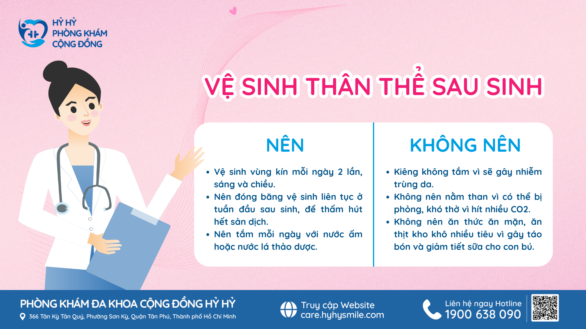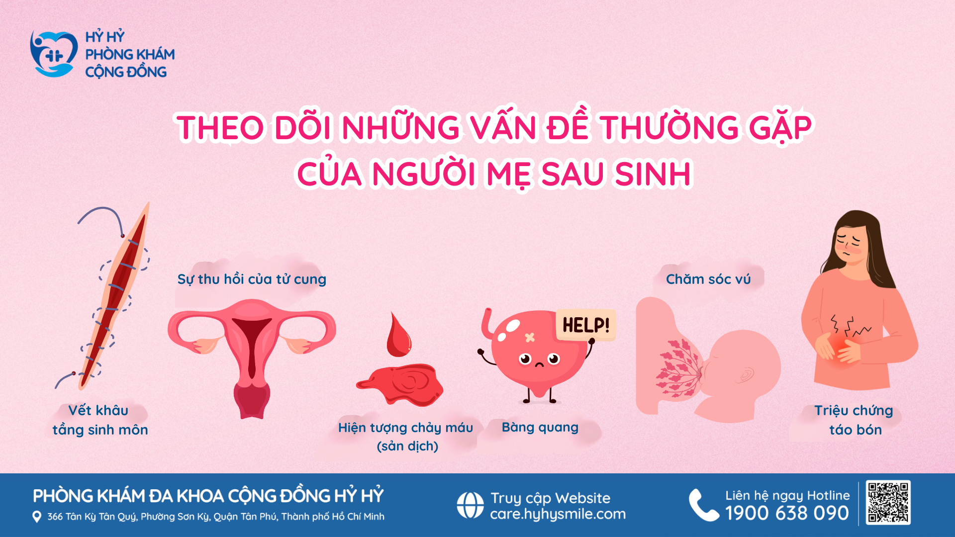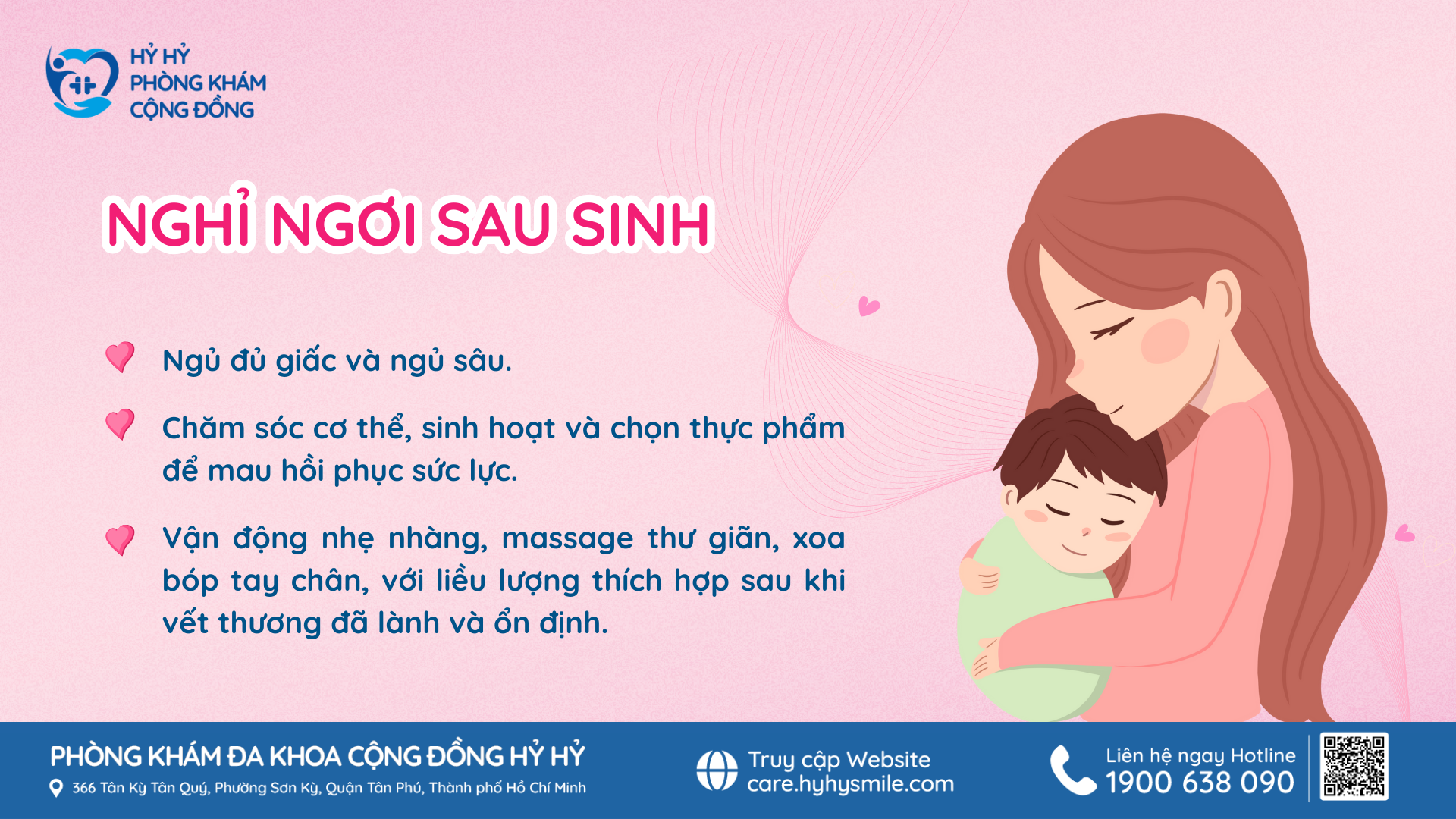 Để biết thêm thông tin về cách chăm sóc sức khỏe sau sinh, cũng như các vấn đề sức khỏe khác, bạn có thể liên hệ Phòng khám Đa khoa Cộng Đồng Hỷ Hỷ theo địa chỉ: 366 Tân Kỳ Tân Quý – Phường Sơn Kỳ – Quận Tân Phú – Tp. Hồ Chí Minh. Hotline: 1900 638 090